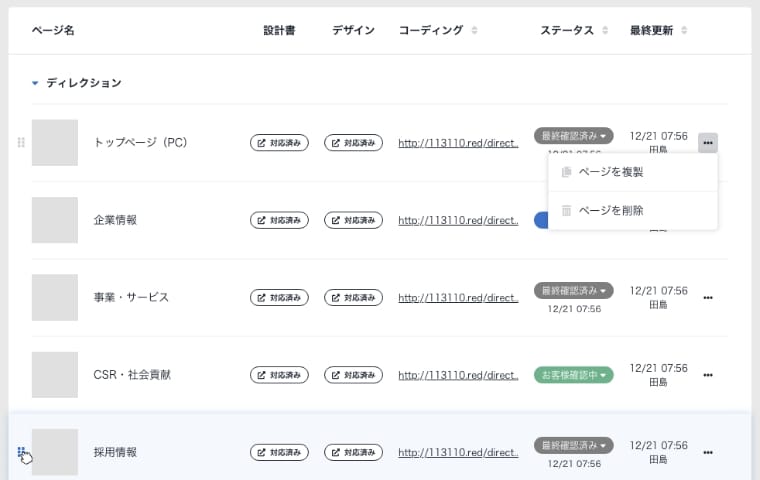 制作ページごと・プロジェクト全体の対応状況がすぐに確認できるので、次のアクションが明確になります。プロジェクト管理の工数を大幅に削減できました。